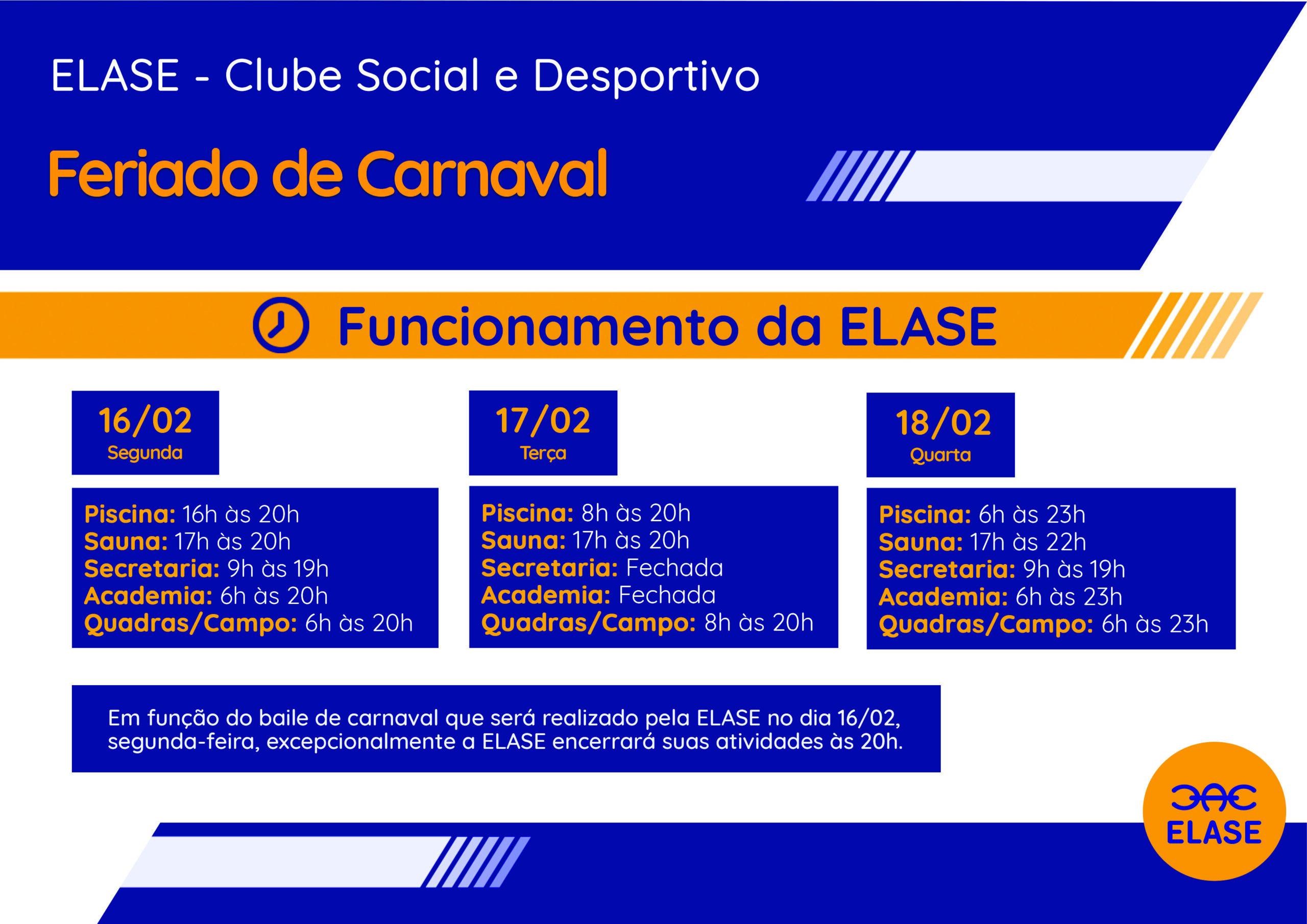 Publicado em 9 de fevereiro de 2026 Confira como vai ficar o funcionamento da ELASE no Feriado de Carnaval. Em razão ao feriado de Carnaval, a ELASE informa aos associados que terá um horário especial de funcionamento. Author: renata