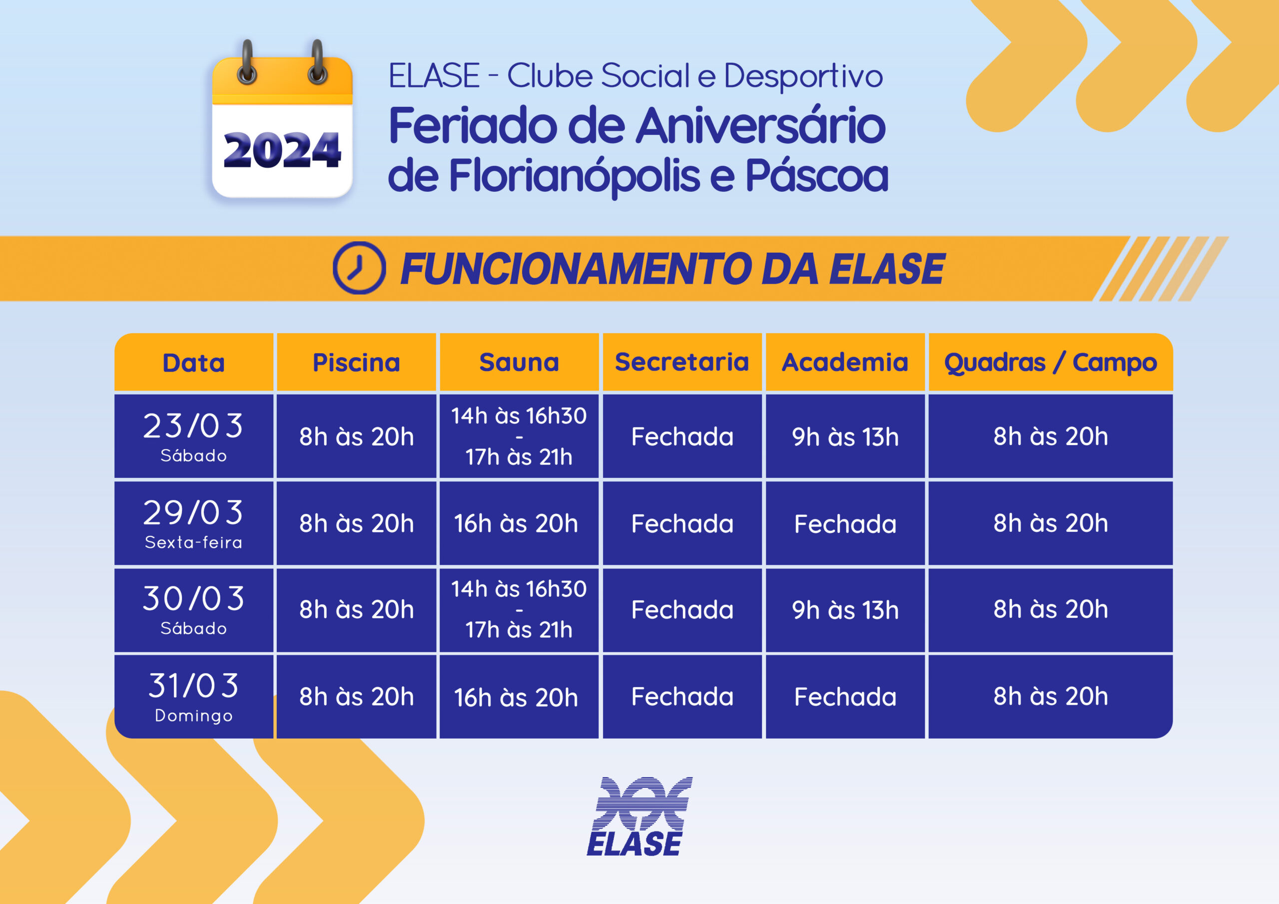 Publicado em 26 de março de 20241 de abril de 2024 Confira como vai ficar o funcionamento da ELASE nos Feriados de Março. Em razão aos feriados de Março, a ELASE informa aos associados que terá um horário especial de funcionamentos. 0831 Author: renata
