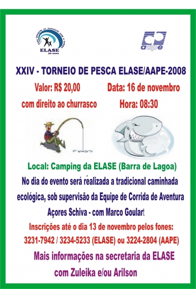No dia 16 de novembro, a partir das 08:30, a ELASE e a AAPE realizam o XXIV Torneio de Pesca e Caminhada Ecológica, no Camping do Clube, localizado na Barra da Lagoa.