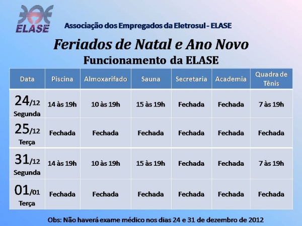 Publicado em 17 de dezembro de 2012 Funcionamento da ELASE no Feriado de Natal e Ano Novo Author: suporte Suporte Técnico.