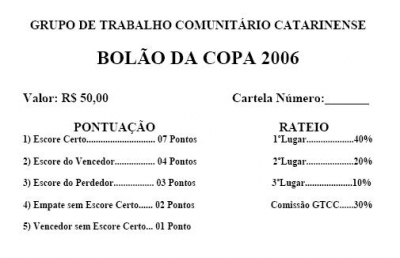 O GTCC está lançando o BOLÃO da Copa 2006 com o objetivo de arrecadar recursos para o Projeto Caeira 21.
