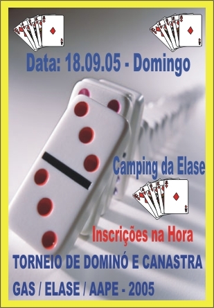 Participe dos  torneios de dominó e de canastra que acontecerão no dia 18 de setembro de 2005, durante o almoço do GAS, na sede de praia na Barra da Lagoa. As inscrições poderão ser feitas na hora.